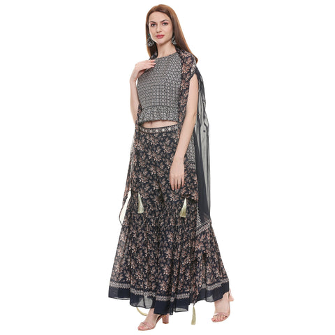 Flared sharara pants paired with crop top embellished with mirror and thread work and printed cape with tassel detail.