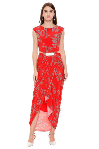 Featuring a printed drape dress with side cut and the golden belt is paired with net asymmetrical cape enhanced with embroidery.