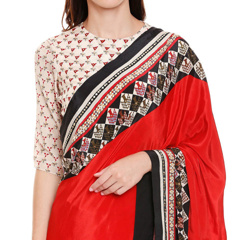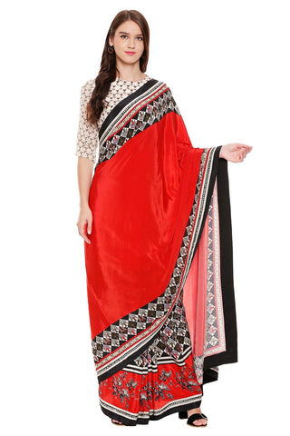 Featuring a red pre-stitched saree in crepe base with print. It is paired with a matching blouse.