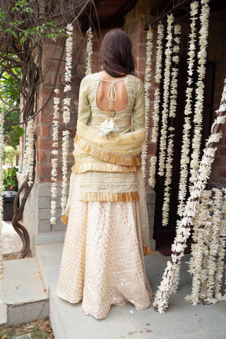 Featuring a sage green kurta with fully thread embroidery with contrasting ivory skirt in chanderi and net duppata with gota details.