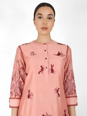 Featuring a Rose Gold chanderi straight tunic with chanderi palazzo pants and marble printed dupatta on muslin fabric.