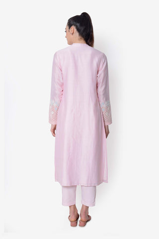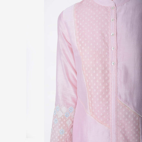 A fabric mix paneled tunic. fit wise: this style has relax fit. This style comes with straight pant and embroidered dupatta in silk organza.