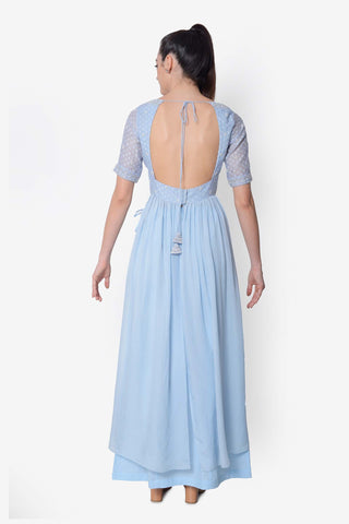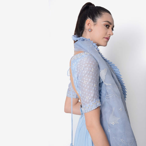 A flying swan motif saree with pleatted border. fitwise: this look has fitted blouse with drape part in silk chiffon at back. This look comes with stitched blouse