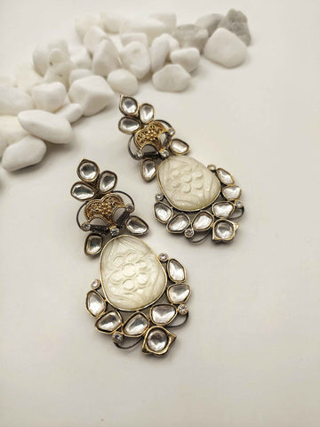 Featuring gold plated drop earrings, adorned with white enamels and studded with semi-precious stones.