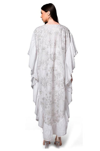 White linen kaftan with silver lurex embroidery and frill edging